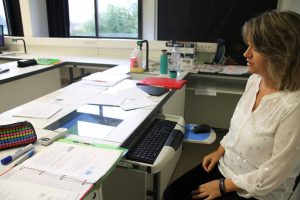 Les aménagements de l’espace professeur concernent principalement la paillasse. L’estrade a disparu pour respecter les normes et un poste professeur semi mobile (table humide fixe et sèche mobile) avec ordinateur intégré a été installé avec une chaise ergonomique réglable et sur roulettes.